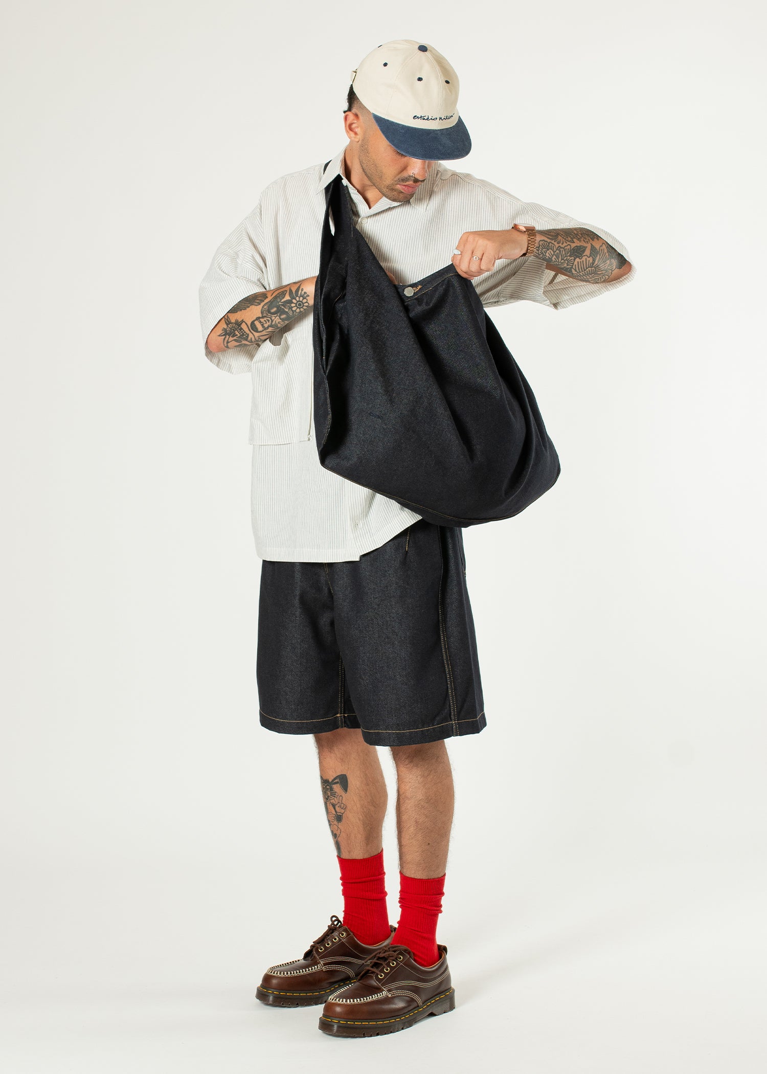 Ce sac en denim brut indigo peut être porté de trois façons. Parfait pour transporter les essentiels de tous les jours. Petite poche intérieure pour les clés, le portefeuille, etc. Fermeture à bouton sur le dessus.