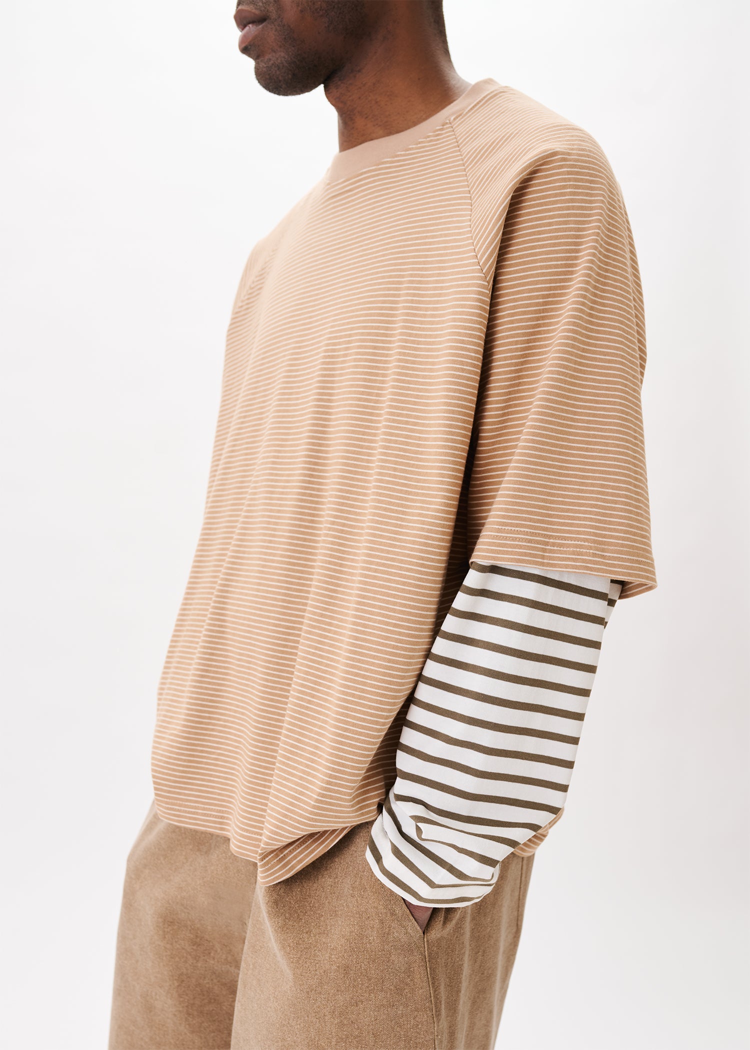 This brown stripe tee features raglan shoulder sleeves and an oversized fit. Layered longsleeves. Premium heavyweight cotton fabric for maximum comfort and breathability. It comes in two sizes.