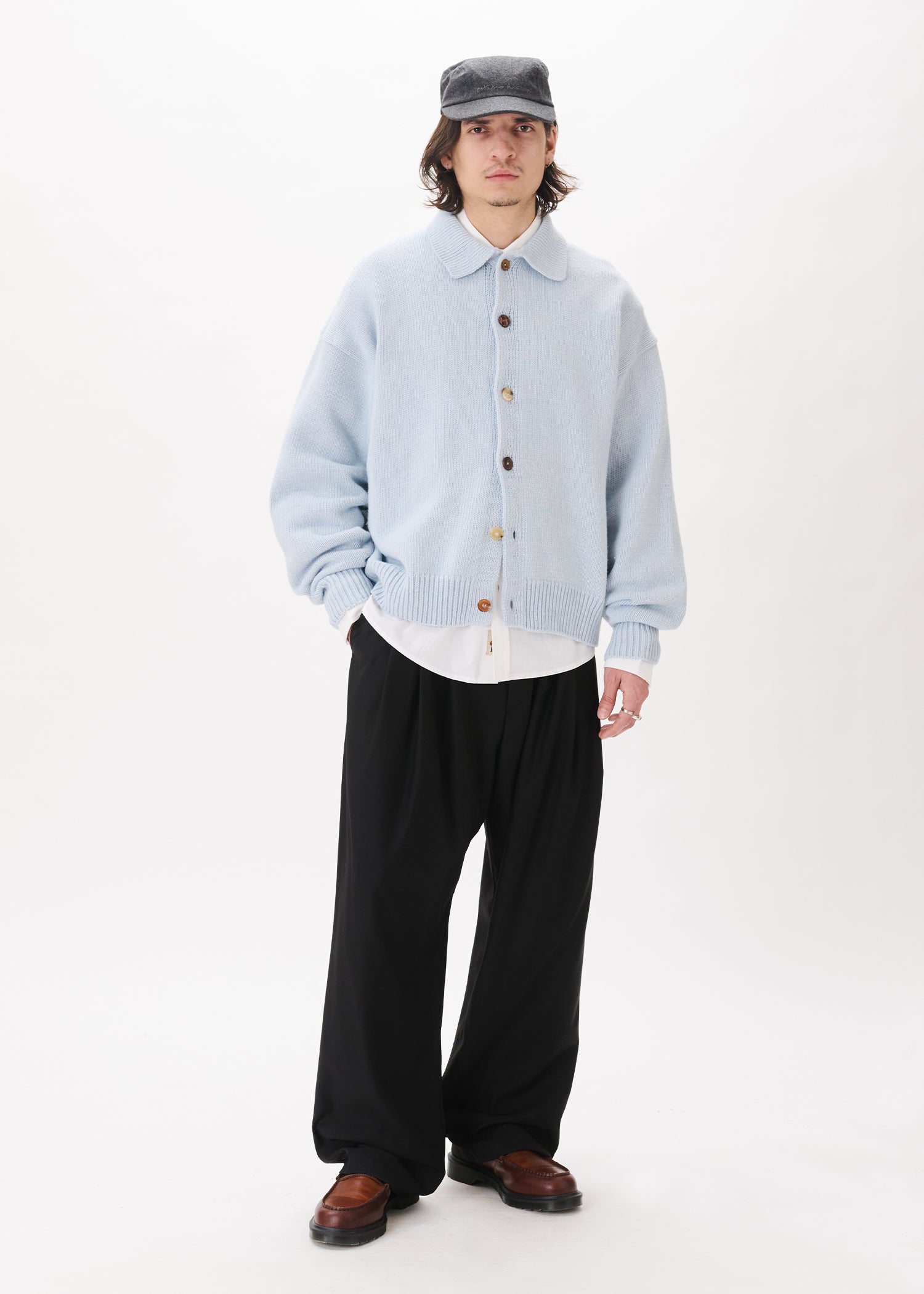 This light blue knit cardigan is made to fit oversized. Mismatched buttons at front. Heavyweight wool-blend fabric for maximum coziness. It comes in two sizes.