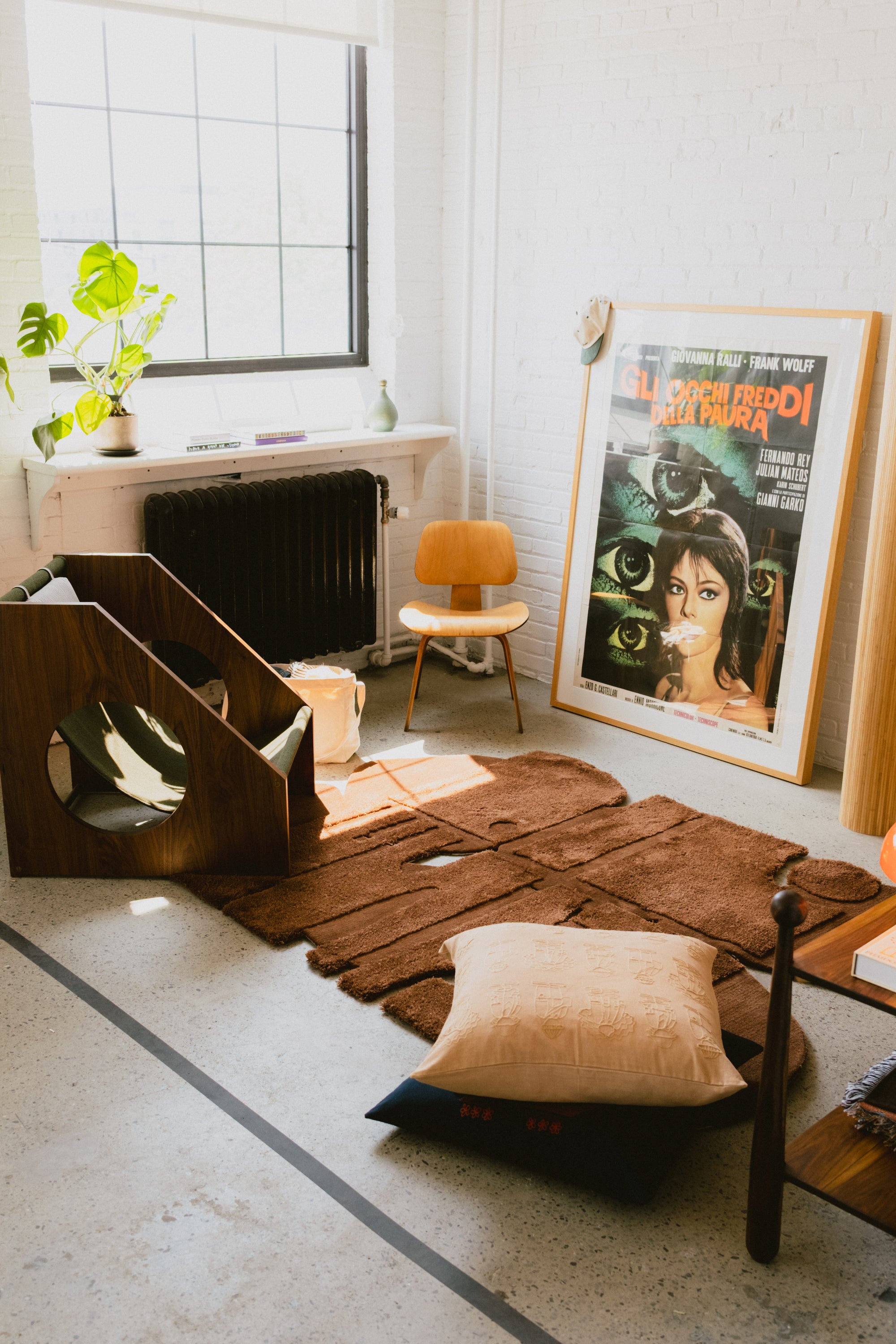 This rug was designed and developed in-house. Featuring Estudio Logo in contrast piling throughout. Ideal for living room, studio etc.