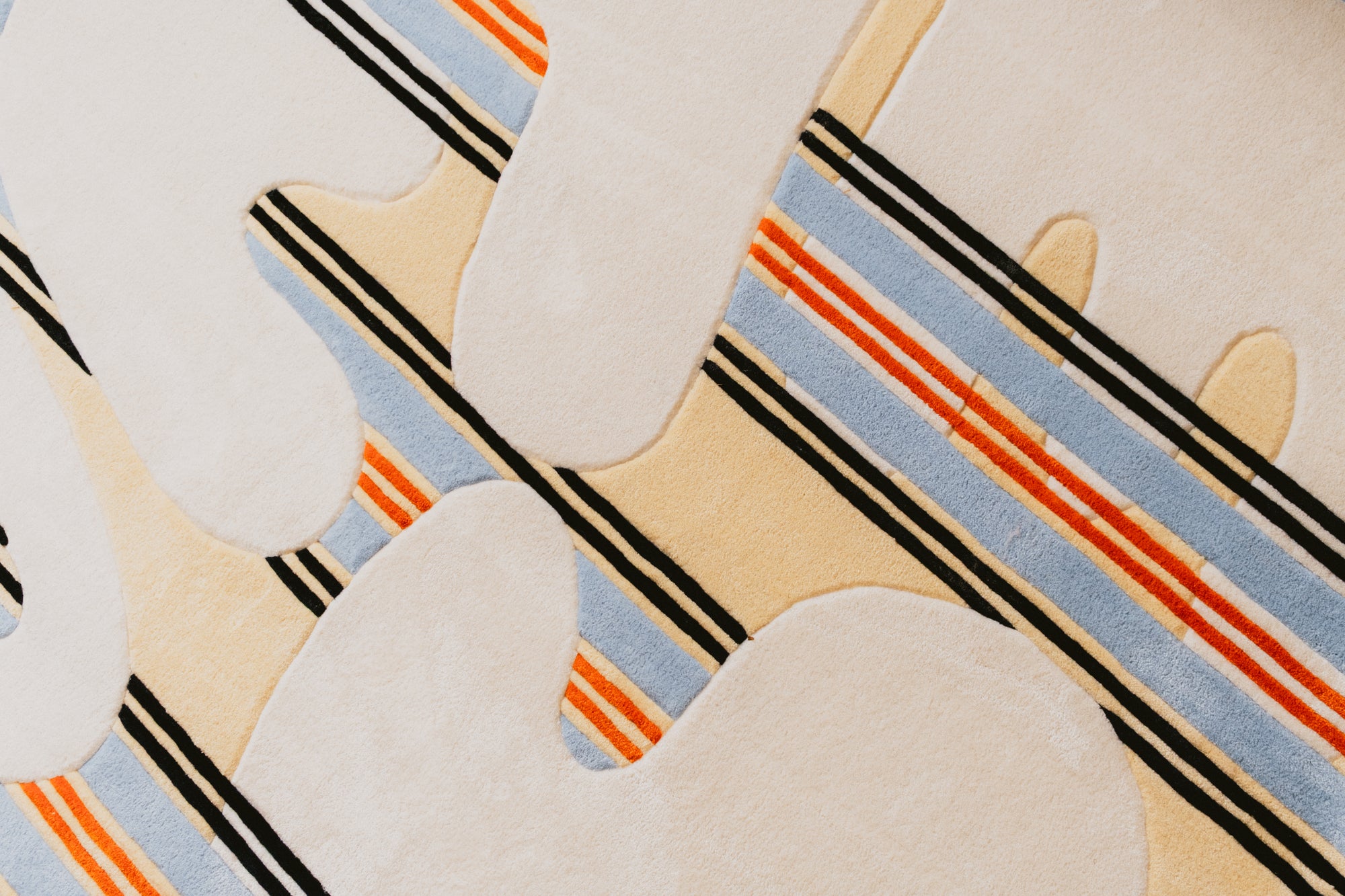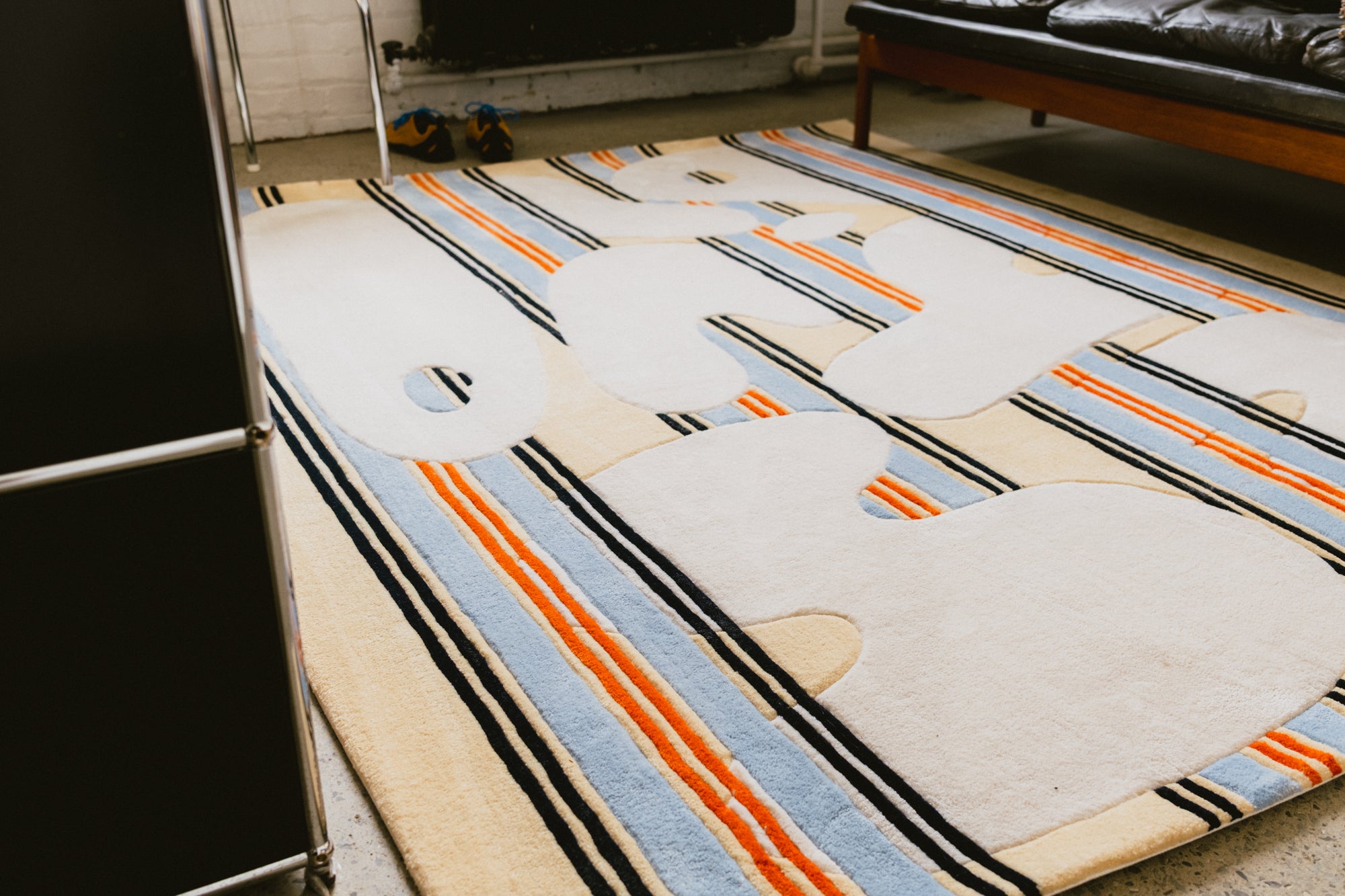 This rug was designed and developed in-house featuring Estudio Logo layered over stripes. Ideal for living room, studio etc.