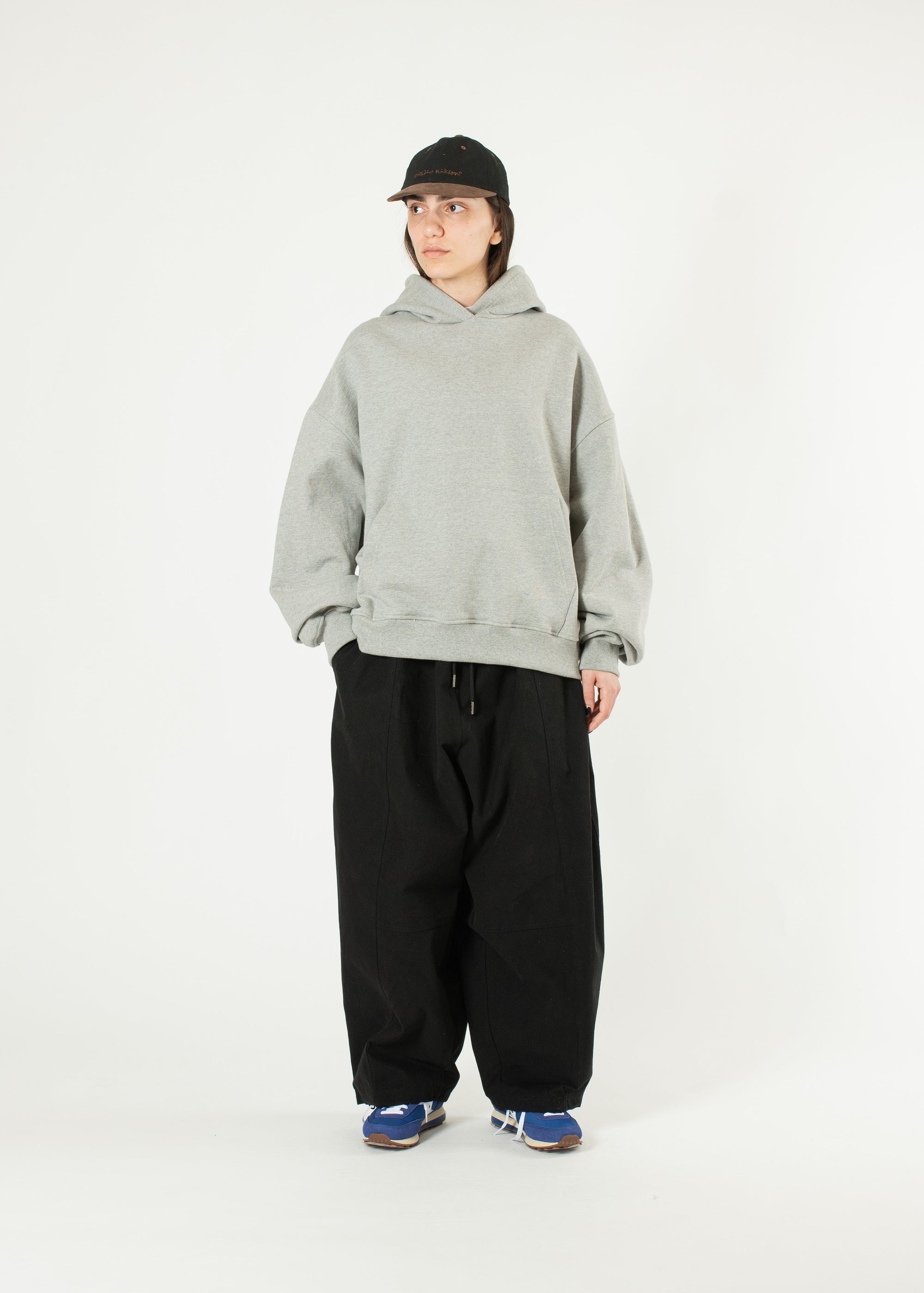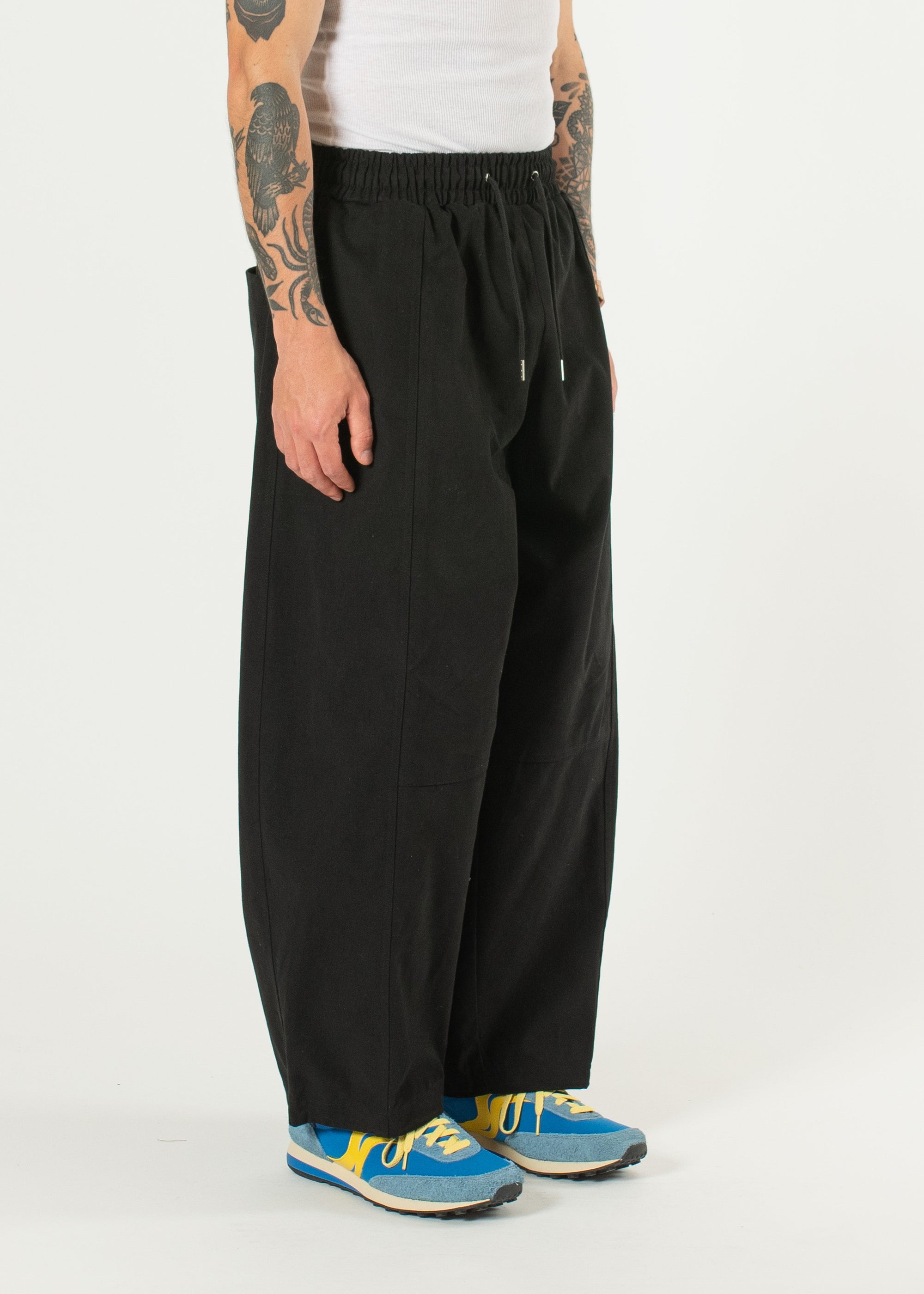 These black pants feature an elastic band and drawstrings. Panelled construction. Embroidered logo at back pocket. Bungee strings at hem for different styling options. They come in three sizes.