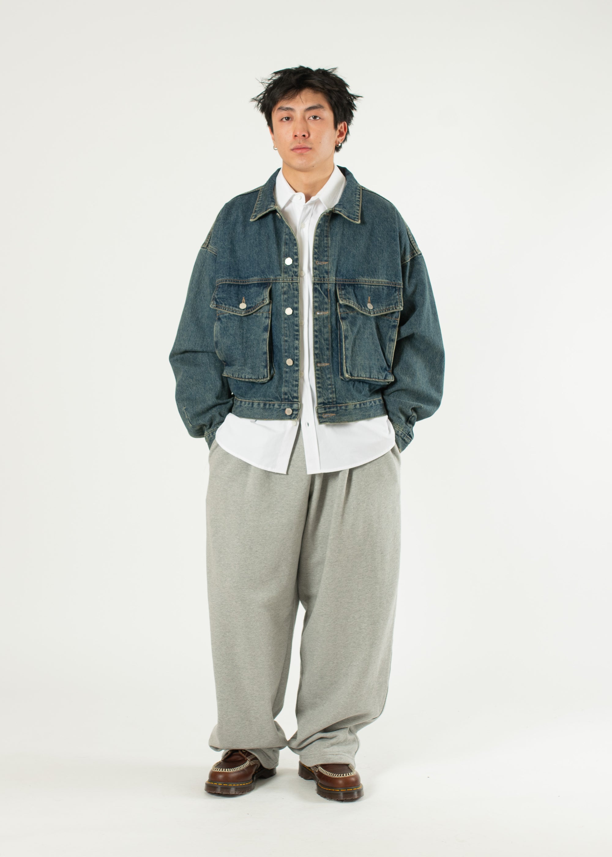 These gray joggers are made of french terry heavyweight cotton for maximum coziness. Wide fit. Waist banding and drawstrings. Pintuck details at waist. They come in three sizes.