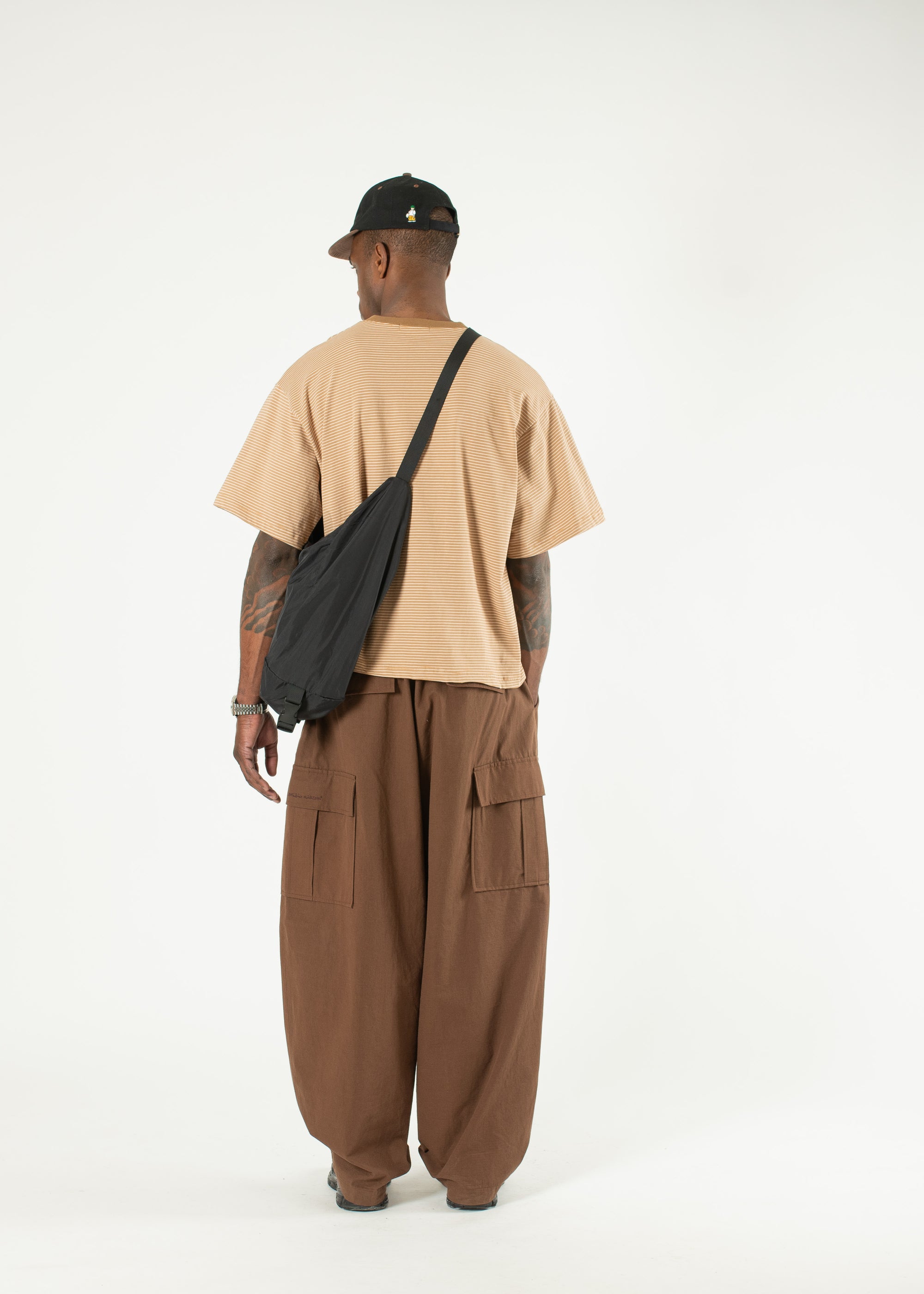 These brown cargo pants are made with resistant and lightweight ripstop fabric for durability and comfort. Elastic bands at waist with drawstrings for ideal fit. Panel construction and embroidered logo on right cargo pocket. Keep in mind these are wide - they come in one size.